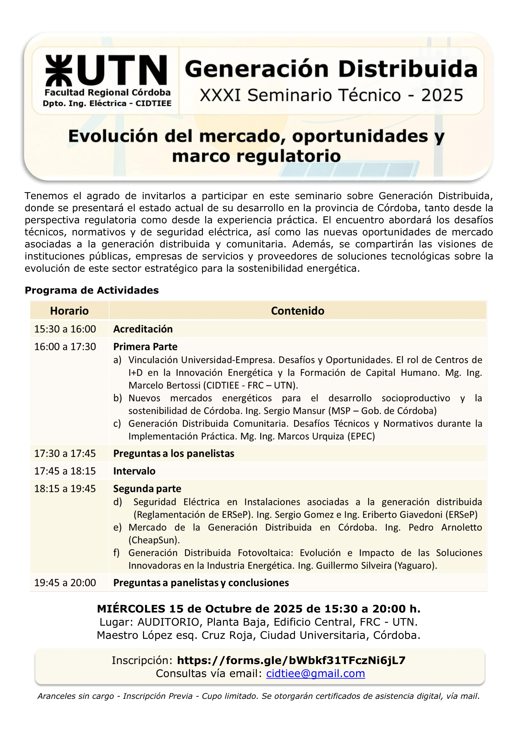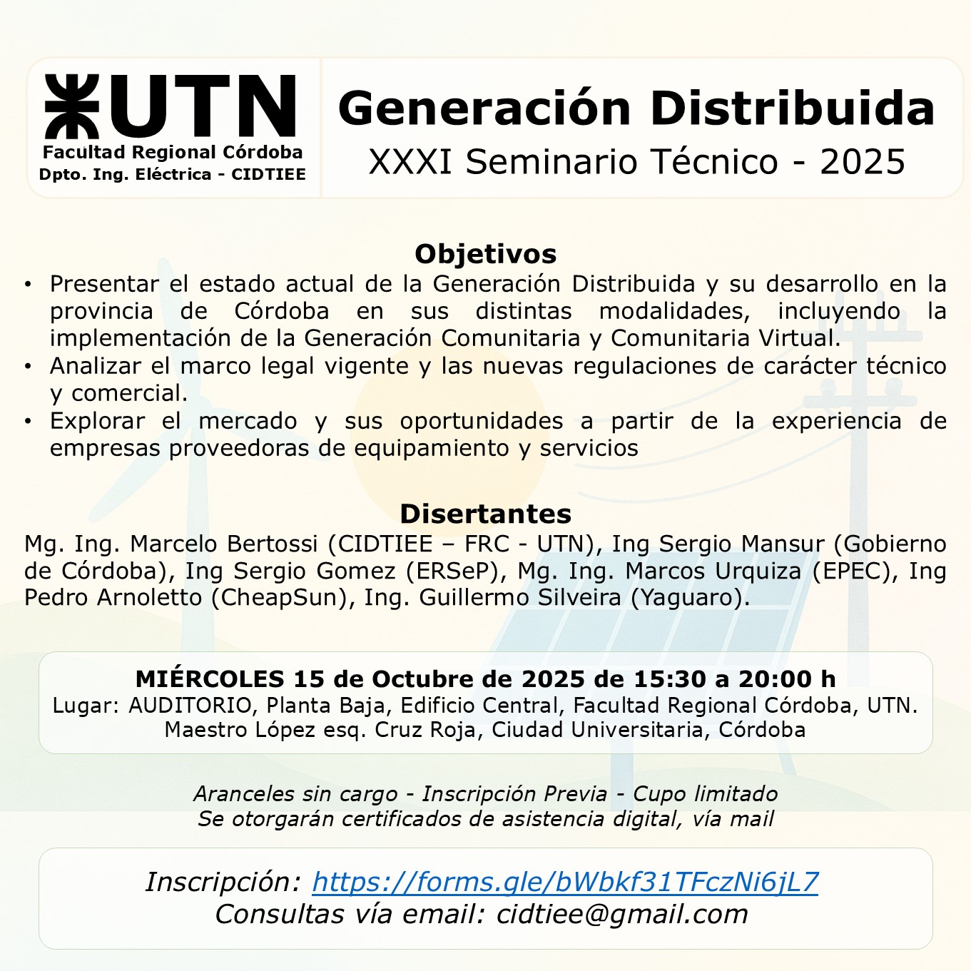 El Departamento de Ingeniería Eléctrica y su Centro de Investigación, Desarrollo y Transferencia de Ingeniería en Energía Eléctrica (CIDTIEE) de la UTN – Facultad Regional Córdoba invitan a participar del XXXI Seminario Técnico sobre Generación Distribuida, que se realizará el miércoles 15 de octubre de 2025 en la Facultad Regional Córdoba.
